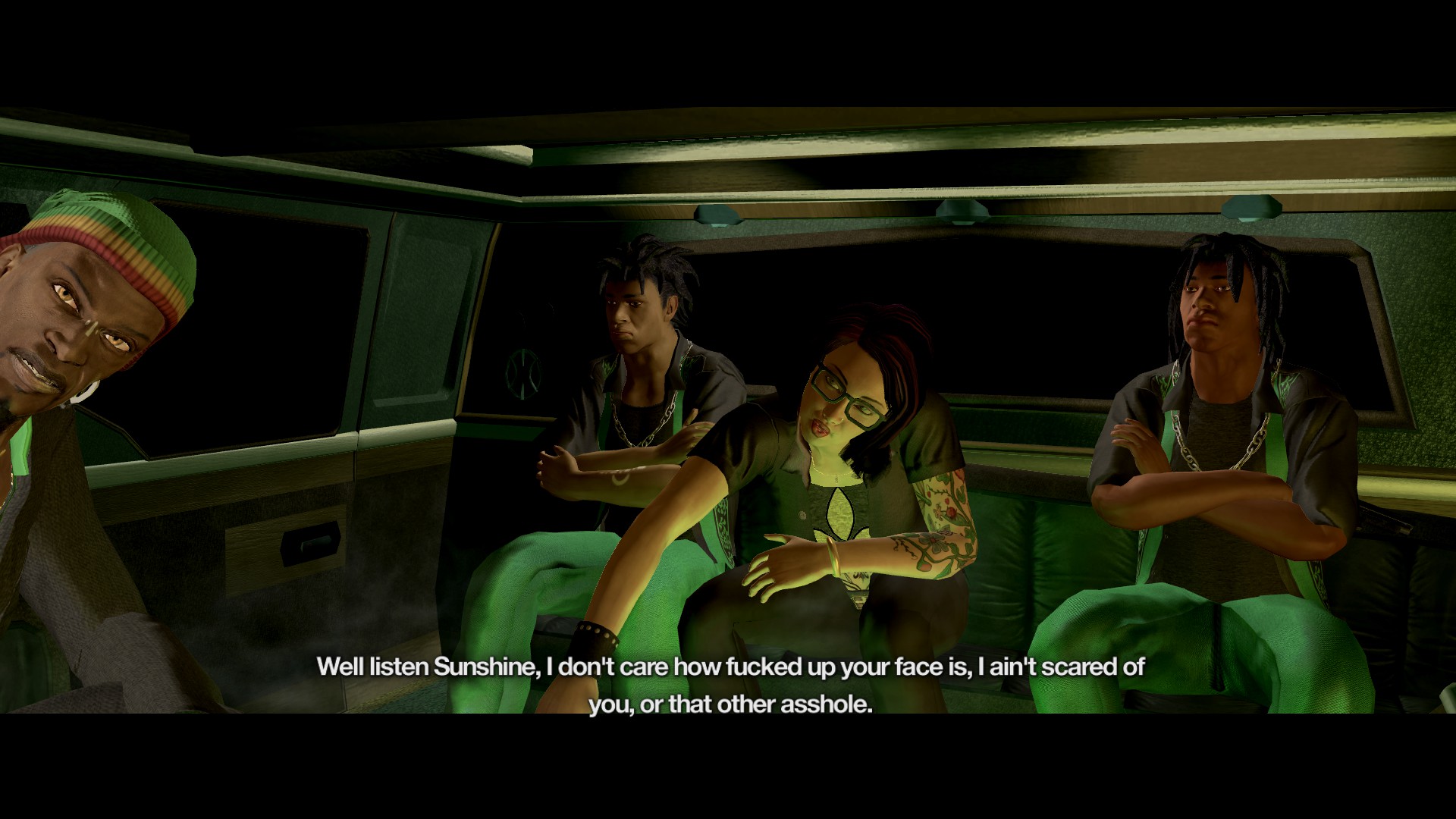 The gangs in SR2 are a lot more colorful than the somewhat generic ones in the previous game. First off, we have The Brotherhood, a bunch of heavily tattooed guys who enjoy loud music and big trucks (their most commonly used vehicle is aptly named “Compensator”) and whose leader, Maero (voiced by Michael Dorn), is an extremely imposing individual. He tries to strike a business deal with the Boss, but that goes to hell when he only offers her 20 percent. The resulting bad blood between the Boss and Maero eventually escalates into full blown Tarantino-esque revenge drama, and as such the Brotherhood storyline is the most gritty and striking in any of the Saints Row games.