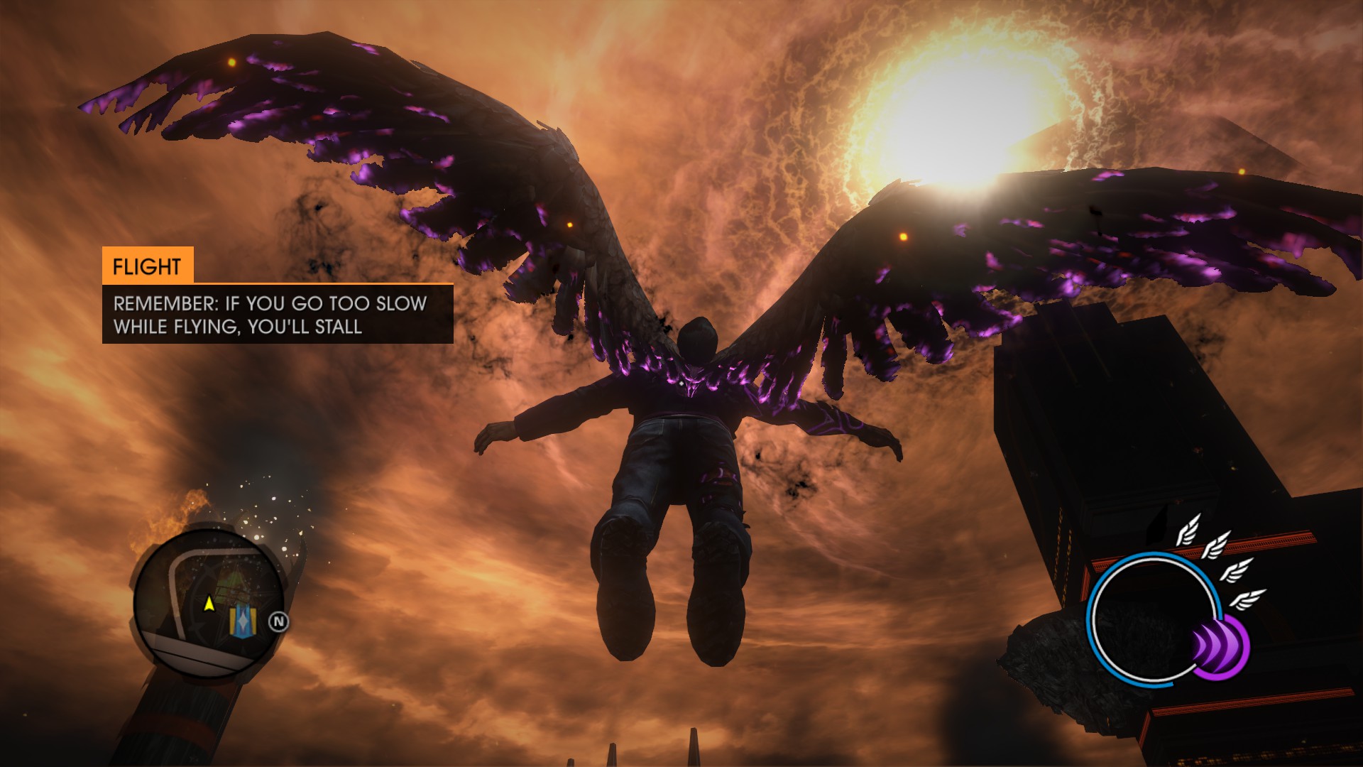 Traversing New Hades is also a blast, as Gat and Kinzie now get wings. Flying around with the hot winds of hell blowing in your face is immensely satisfying, especially after you’ve collected a few soul clusters to upgrade your flight ability. While flying, you can hit A (up to five times, depending on upgrade level) to flap your wings and gain height, and you can also dive bomb to gain more speed. Finally, there are the aerial maneuvers, which allow you to dodge anti-air missiles later on in the game.