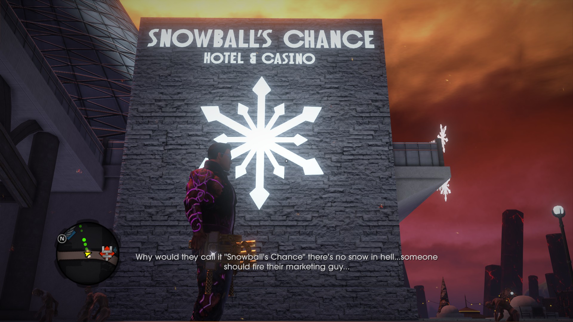 Now, to be entirely fair, Gat Out of Hell gives you an entirely new city to play in, so at least we’re not going to Steelport for the third time (frankly, the second time was pushing it). At a glance, New Hades doesn’t look like much, because… well, it’s hell so the visuals have a lot of the old hellfire and brimstone thing going on and all the citizens are identical shambling husks, but it’s actually quite a well-designed open world environment. The districts are actually different this time around, my personal favorite being the favela built next to a lake of fire. A lot of the map is dominated by industrial and business structures, with Ultor being a major player in the city due to Dane Vogel’s efforts, but there’s also a high-end entertainment district (the highlight of which is the Tempest club, where Shakespeare himself works as a DJ and gives you missions) and other things that help the areas feel distinct.