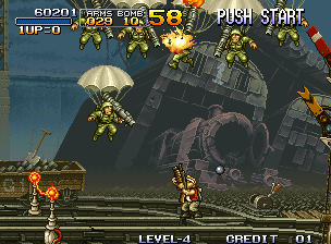 You start Metal Slug with a basic pistol that gets the job done in a pinch, but you’ll want to grab one of the weapon upgrades to increase your chances of survival. The heavy machine gun is just, well, what it says on the tin and is also able to shoot diagonally; the rocket launcher is a bit slower but blows shit up real good; the flame shot immolates enemies (and has fantastic range unlike most flame weapons in games); and the shotgun literally disintegrates enemies. Fairly basic stuff, but extremely satisfying to use. Even just picking them up is great, because you always get to hear the over-the-top announcer voice yell out the name of the weapon in a slightly Engrish-y accent. RAWKET LAWNCHAIR! (yes, I know that particular sample isn’t used until Metal Slug X, but who cares)