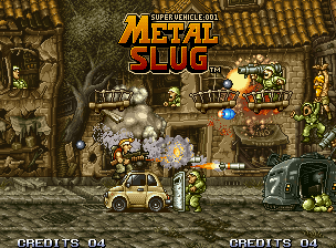 Each level also features the titular Metal Slug, a badass tank that crushes enemy troops beneath its treads and is equipped with a powerful cannon and (limited) missiles. It can also crouch and jump, somehow. Most importantly, the Metal Slug provides extra protection for the player characters, as Marco/Tarma can only take one hit. The game is a bit of a quarter-muncher, especially in the later levels where the action gets so intense that you can barely see the tiny bullets flying at you, but it’s not as mercilessly unfair as some other games in the run-and-gun genre or even some of the other Metal Slug games. Decent twitch gaming skills and pattern memorization are absolutely a must if you want to get to the end without spending a ton of credits, though.
