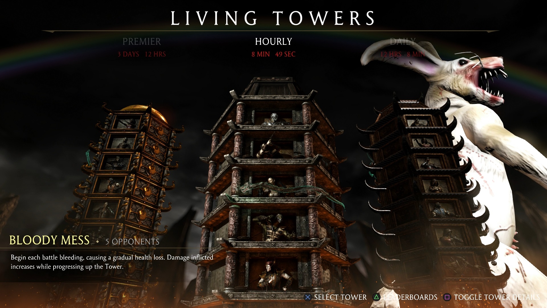 Mortal Kombat X offers a variety of modes for single and multiplayer, with the usual single match and versus (no more tag team mode) and training modes accounted for, as well as online matches. Test Your Might and Test Your Luck make a return, and the Towers mode features challenge towers with various gimmicks along with the regular arcade ladder. The Living Towers mode offers a variety of extra-special challenges which are updated regularly. At the moment, there is an Easter-themed premier tower available, with a giant bunny stomping around in the menu background and looking murderous.