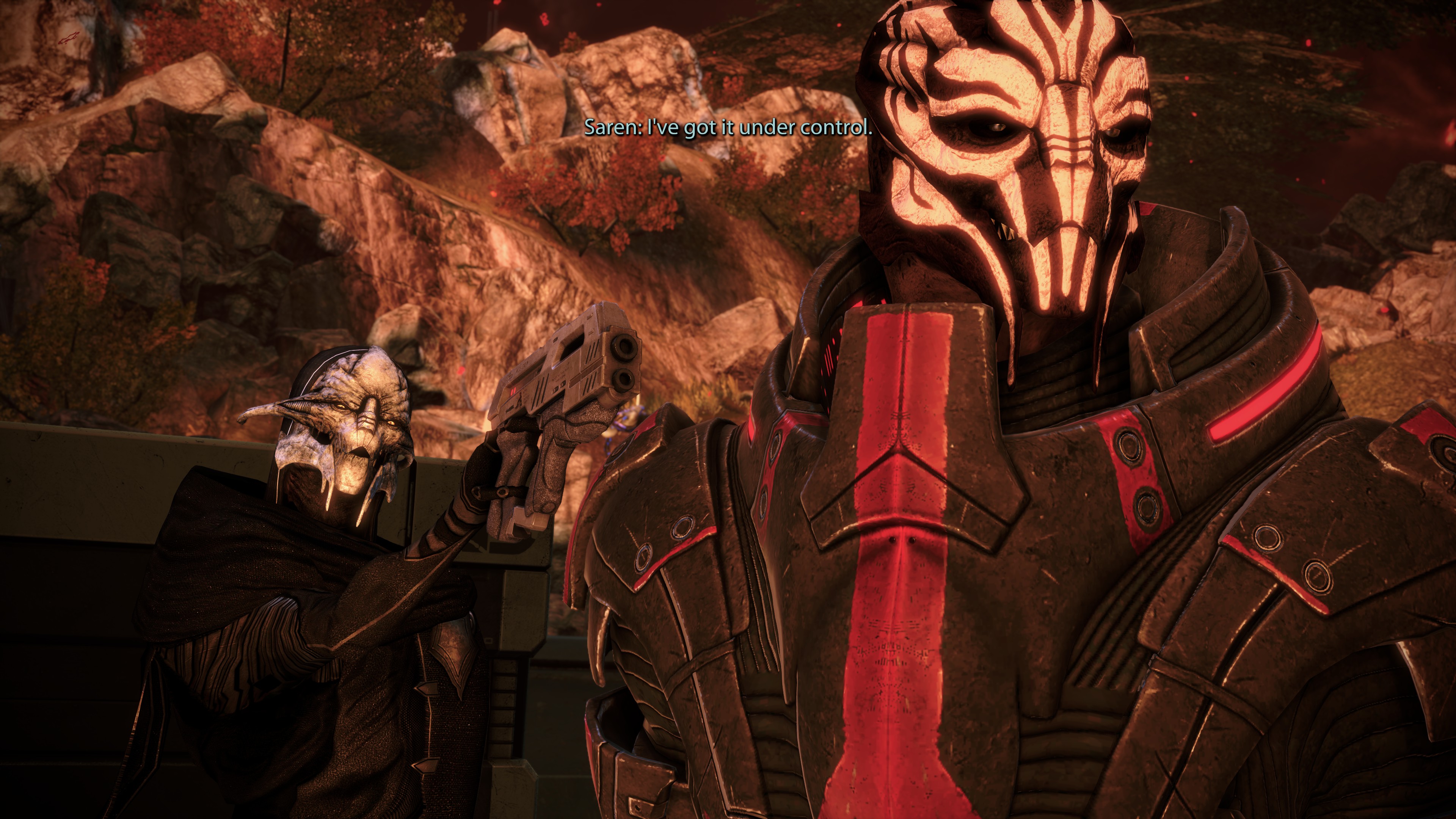Saren, of course, appears even more villainous, as he looks to be part geth. Apparently, he was supposed to look more organic at this point of the game, but that model was never implemented so he just looks like a half-synthetic nightmare turian from the start. Nobody ever brings that up at all for some reason. Shepard doesn’t say, “Hey, this guy has robot eyes, a robot arm and a bunch of wires all over his body, and that stuff looks mysteriously like the geth and the robot zombies we fought on Eden Prime!” I never said this game was perfect.