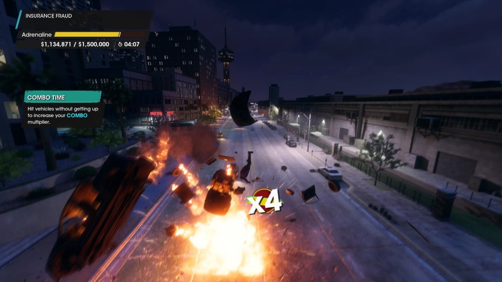 I think Insurance Fraud in this game is genuinely great. It’s one of my favorite implementations in the series, if I’m honest, and I don’t mind booting the game up just to play it. I don’t know if they really needed to make cars explode when you hit them in Adrenaline Mode, but it’s a lot of fun nonetheless.