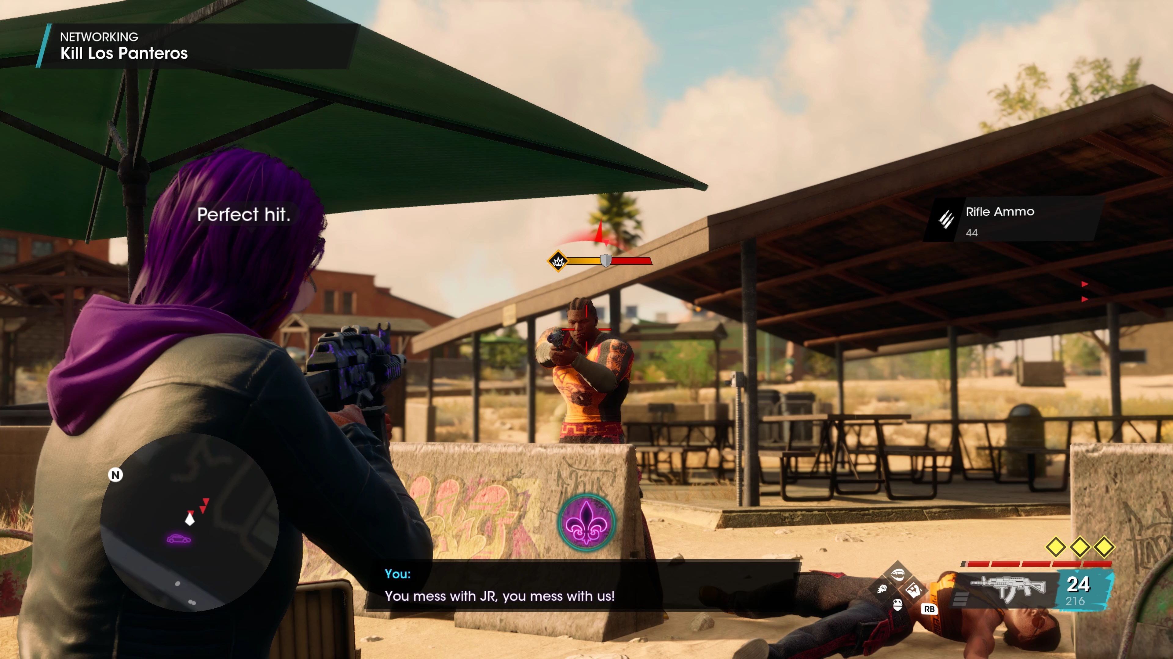 Santo Ileso is also home to the Panteros and Idols gangs. Los Panteros like loud music and even louder cars, and they control the southeast part of the city. The Idols are an anarchist cult all about dressing up in flashy neon helmets and Sticking It To The Man (or so they claim), inhabiting the northeast. The western part of Santo Ileso is controlled by Marshall Defense Industries, a private military company protecting the interests of the rich and powerful. And in the middle of Panteros territory, we find a certain bunch of misfits living in a crappy apartment and struggling to pay the rent. This is our main crew that will eventually become the Saints.