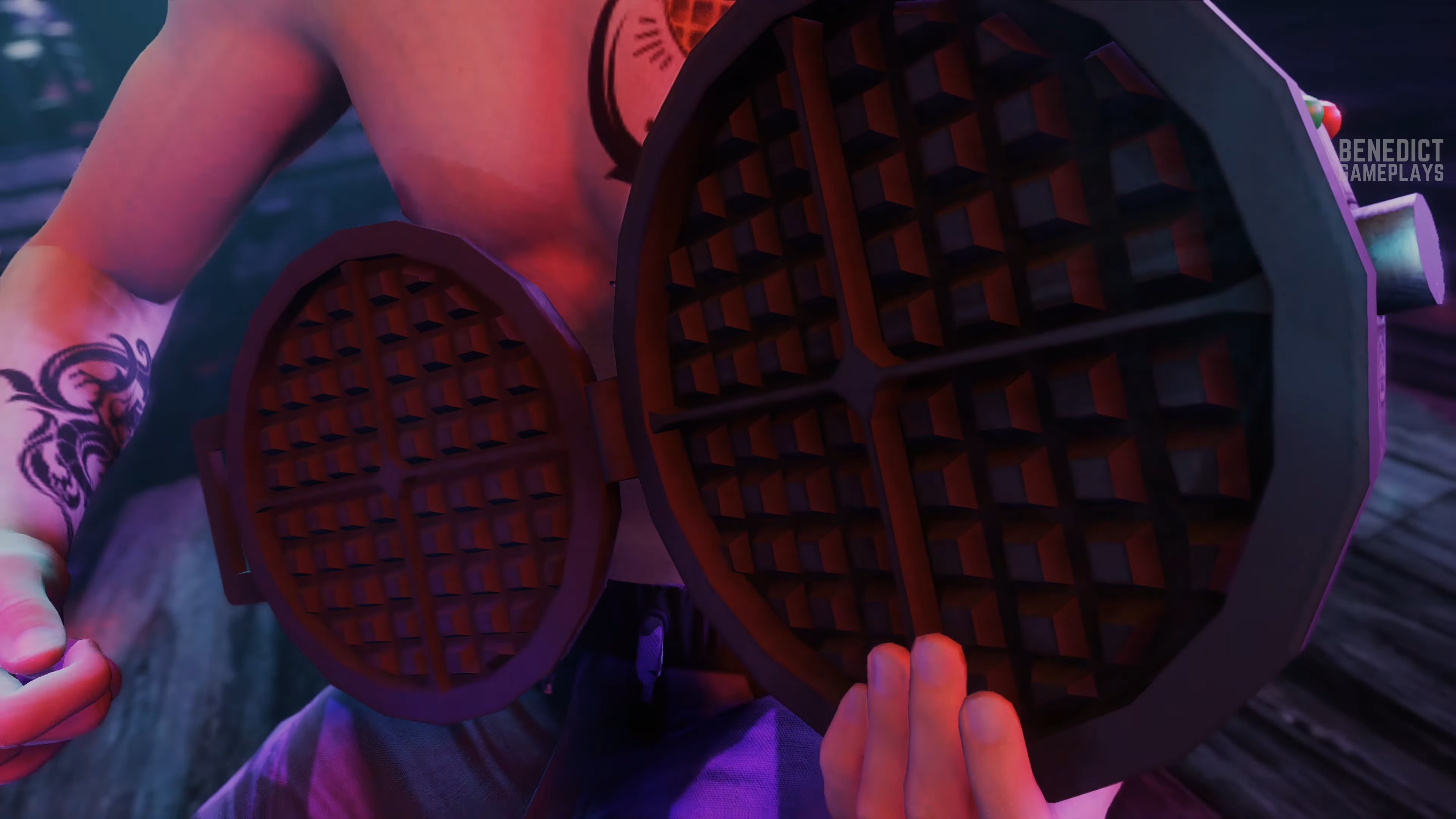 This shot from the “Love Shack” ending with Kev playing air guitar on a waffle iron has to be a reference to the Rock Band games of all things, because this exact camera angle is used all the time to show off your band’s guitarist, well, showing off during solos. Image credit: Benedict on YouTube
